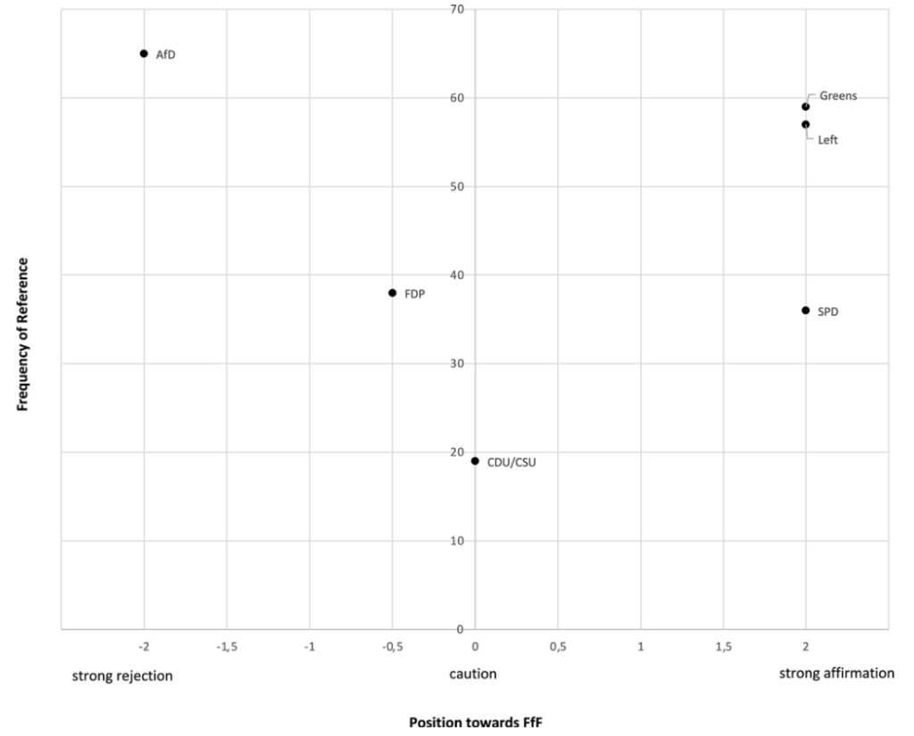 Using this approach, we can show clear differences between party responses with centre-left parties taking a stance as supporters and friends of the movement. In particular, the right-wing populist AfD not only rejects Fridays for Future but even defames its protagonists and supporters.